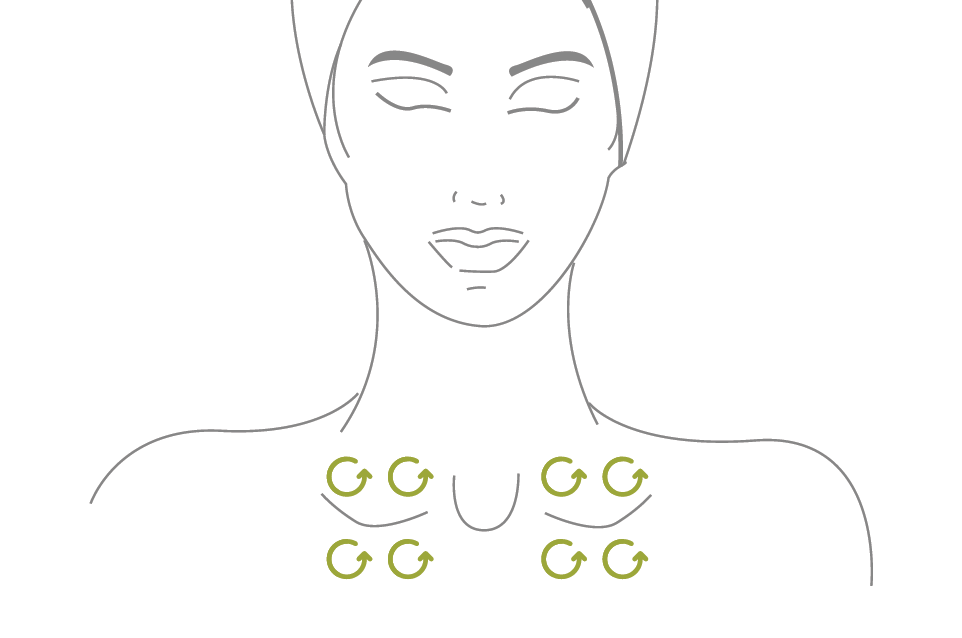 Begin by placing the massage head on your sternum, conduct slow circles from the centre of your chest to your underarm on the right hand side. Use light pressure, following the lymphatic system. Repeat this movement for six cycles.